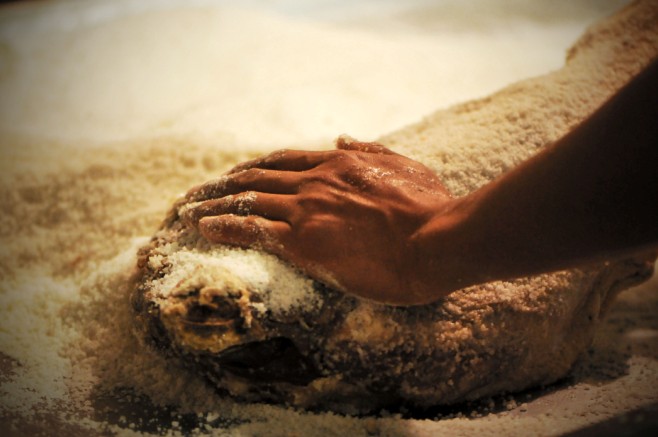 腌制火腿要使用大量的鹽,鹽并不是一次性倒入到火腿當(dāng)中的,而是要將鹽均勻地涂抹到肉腿上面。涂也不是一次性就能涂抹好,每條腿可能都要經(jīng)歷6—7次“美膚”和“按摩”的過程,最終表面結(jié)成白色的鹽霜,肌肉變得堅硬緊實了才算可以了。第一次抹鹽叫做“上小鹽”,就是先將薄鹽抹在豬腿的表面,然后腌制一晚。第二次抹鹽叫做“上大鹽”,是在“上小鹽”的次日,這次要先將腌制出的血水用手?jǐn)D出,之后再均勻地涂上新的鹽。之后的上鹽均是在肉質(zhì)比較肥厚和筋骨相連的地方著重補鹽,時間則是在第7天、第13天、第27天。經(jīng)過這些次的鹽腌,整條豬腿均被食鹽腌透浸滿,腌的時候碼放也是有講究的,皮朝下肉朝上,最后一層則是皮朝上的。