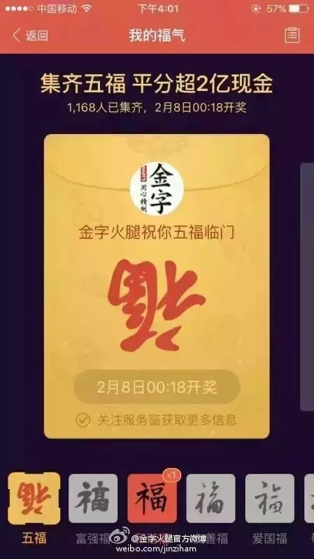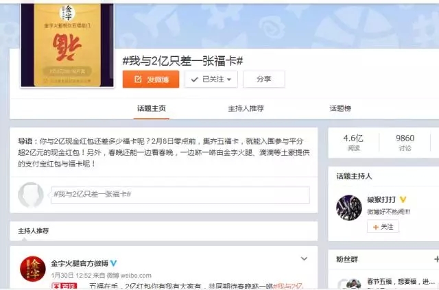 自前幾天支付寶將“集5福,搶2億+紅包”的活動(dòng)規(guī)則公布后,一時(shí)間,有關(guān)??〒Q贈(zèng)的話題強(qiáng)行霸屏。在有金字粉絲集齊了五福后,金字順勢在微博平臺上策劃的#我與2億只差一張???的微話題就引發(fā)了高達(dá)4.6億的閱讀量,網(wǎng)友們通過點(diǎn)贊評論及轉(zhuǎn)發(fā)分享的方式,第一時(shí)間表達(dá)了自己對于五福福卡和春晚2億紅包的高度期待!