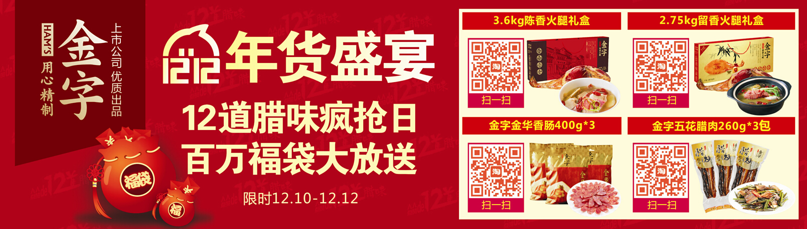 2015呼之欲來,在2014的年末,金字火腿以“12道臘味”致敬你過去1年的辛勞。12月12日,在金字火腿天貓旗艦店,最經(jīng)典的12款寶貝價格最低2折起,滿318元就送百元福袋(內含2包45g肉棗、2包40g火腿片、1張肉票、1份利是封),還可參加抽大獎活動,屆時將會抽取2名價值不菲的巴瑪火腿大獎和24名價值500元的12道臘味大獎。