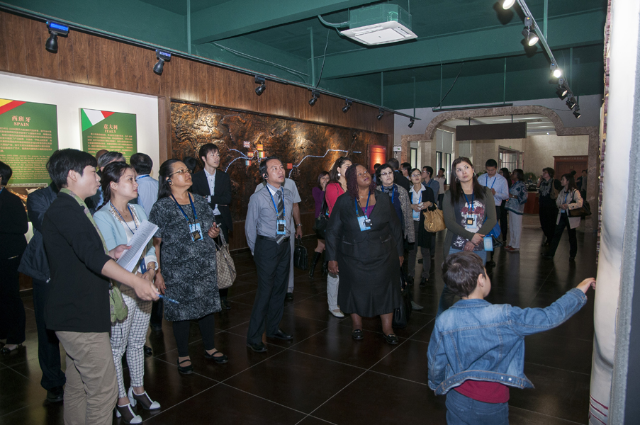 從一進(jìn)中國(guó)火腿博覽館的大門開始,使節(jié)們就被眼前精美的浮雕所吸引。透過金字火腿吳月肖副總經(jīng)理有趣的解說和翻譯的詳盡翻譯,50余人才搞明白:原來這就是著名的《百姓勞軍圖》,而使節(jié)中的一些“中國(guó)通”發(fā)現(xiàn)他們熟知岳飛的師傅宗澤,原來竟然是金華火腿的祖師爺,火腿原料金華兩頭烏如此有趣珍貴,就好比中國(guó)的熊貓。